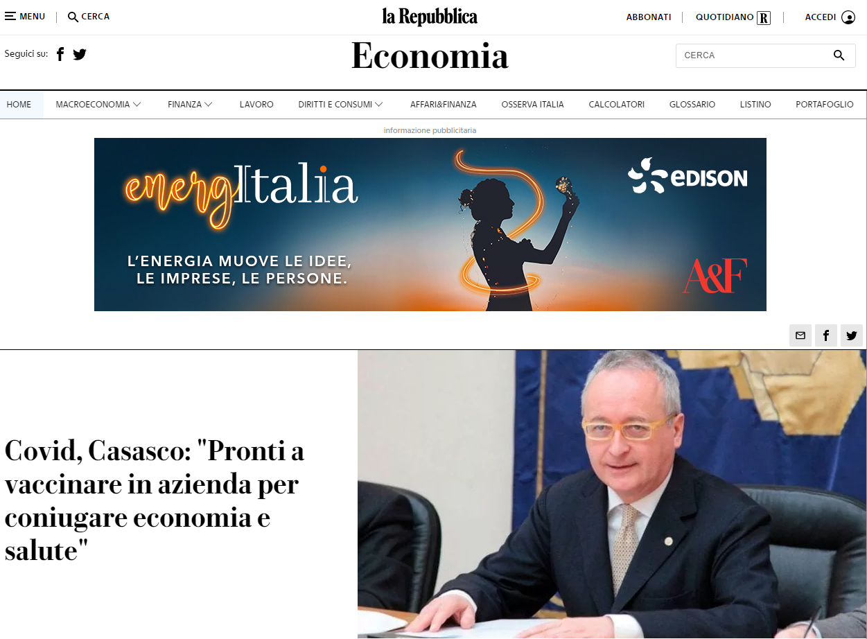 Covid, Casasco: "Pronti a vaccinare in azienda per coniugare economia e salute"